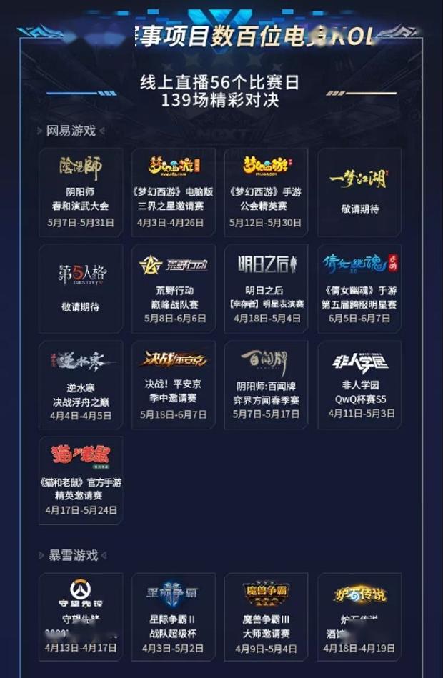 今年的2020网易电竞NeXT春季赛覆盖18个产品赛事项目,包括4款暴雪产品,预计覆盖大部分网易游戏玩家和职业选手。赛事集结了《梦幻西游》电脑版、《梦幻西游》手游、《阴阳师》、《决战!平安京》、《阴阳师:百闻牌》、《一梦江湖》、《第五人格》、《荒野行动》、《明日之后》、《倩女幽魂》手游、《逆水寒》、《猫和老鼠》官方手游、《非人学园》、《守望先锋》、《星际争霸Ⅱ》、《魔兽争霸Ⅲ》、《炉石传说》等网易及暴雪旗下人气佳作及经典旗舰,新赛季新起点,全面焕新,更竞一步。